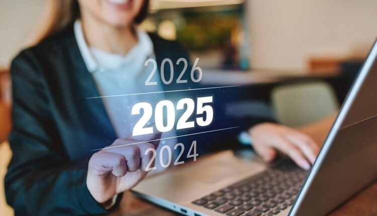 (Image: A young woman sits at a desk. A laptop computer is open on the desk. The number 2025 is projected in front of her, and she points to it with her index finger. Credit: Getty Images)