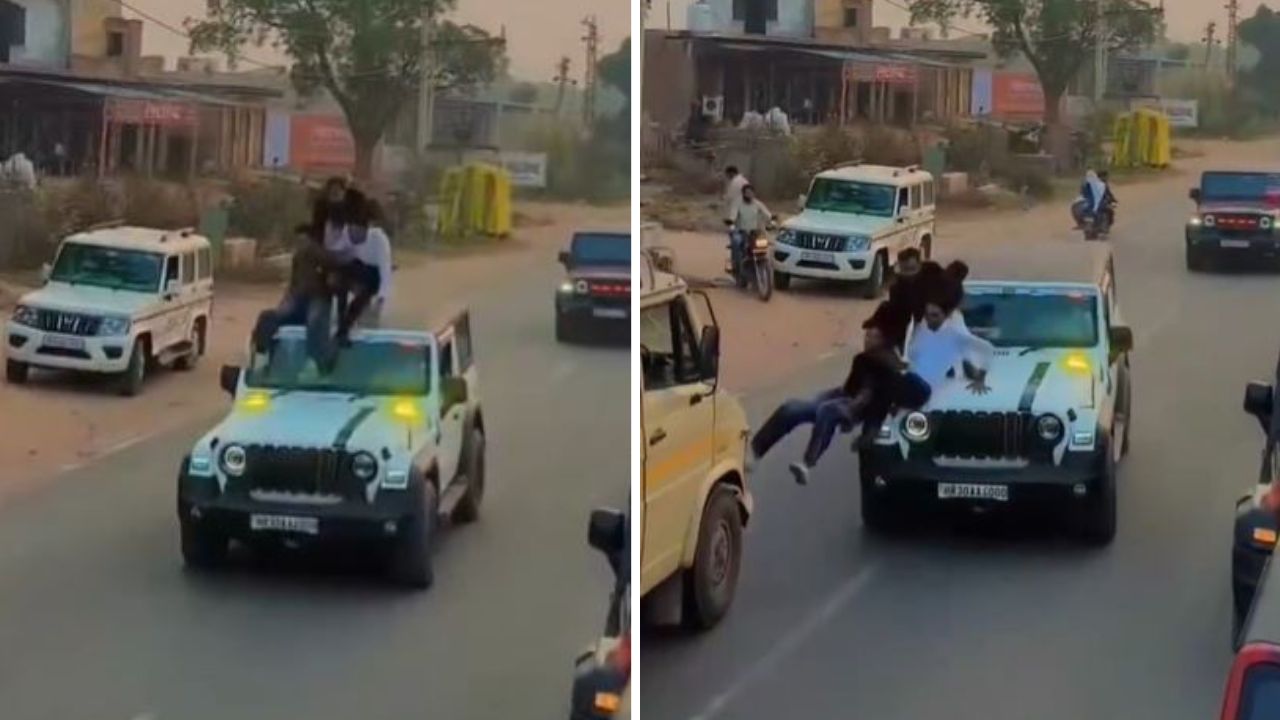 Reckless Driving Reel: In the race to become famous on social media, some youth are even risking their lives. Recently, in a viral video, it was seen that four youths were making a reel while standing on the bonnet of a Thar vehicle running with the convoy.