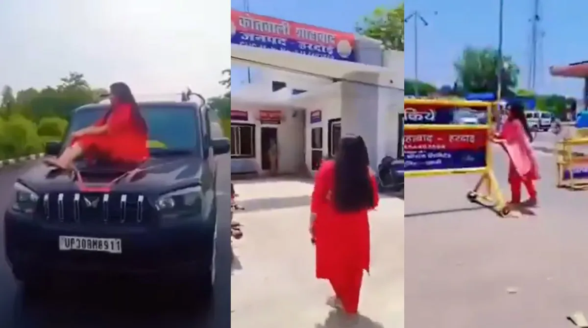 In the first scene, the girl, wearing a red salwar suit, is making a reel while dancing vigorously right in front of the main gate of the police station. The second scene is even more shocking – she herself removes the police traffic barricades installed on the road with her own hands. In the third scene, the limit has been reached – the Scorpio is doing dangerous stunts by sitting on the bonnet of a moving car.