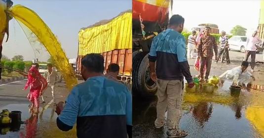 Villagers were seen filling not only the tanker but also the oil stored in the pits on the road and side in different vessels. During this time the stream of oil continued to flow and the crowd of people kept increasing. As soon as information about the incident was received, Mehndwas police station reached the spot. Despite the presence of police, the villagers continued filling oil and this continued for a long time.