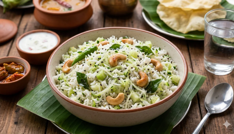 Cucumber Rice is refreshing, hydrating, and quick to make, coming together in just 15 minutes. This makes it a perfect choice for hot summer days. In this recipe, cooked rice is mixed with grated cucumber and a flavourful tadka made with onions, curry leaves, mustard seeds, peanuts, and chana dal (split Bengal gram). Roasted cashews are added for a pleasant crunch, while fresh green coriander leaves enhance the flavour. Some people also like to add freshly grated coconut for extra freshness. To make sure the rice doesn’t turn soggy, always squeeze out the excess water from the grated cucumber before mixing it in. Serve this warm dish with raita for a comforting and wholesome meal. It works well for lunch and is also a great option for your office tiffin.