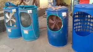 To make this, you will need a 200 liter plastic drum, an exhaust fan, a submersible pump, and some cooling pads. Cut windows on three sides of the drum and place grass there with mesh. Lay a water pipeline on top which will keep the pads wet. This setup not only throws cool air, but also reduces the surrounding temperature rapidly due to evaporation of water.
