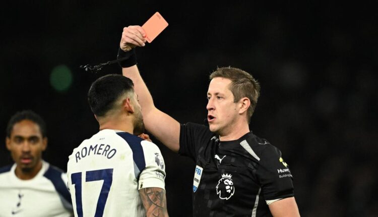 Romero’s dismissal left Spurs down to nine men as Xavi Simons had already been shown a red card for serious foul play in the first half.