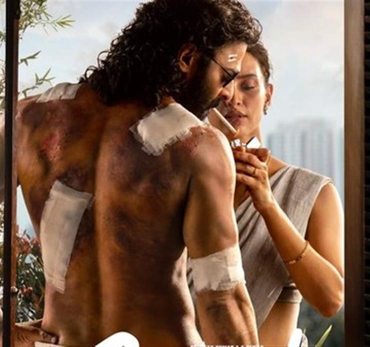 The poster features a wounded Prabhas standing by the window, while Triptych can be seen lighting his cigarette.