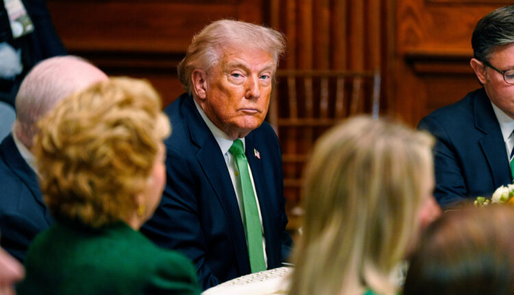 President Donald Trump listens to a reporter’s question during a meeting with Irish Prime Minister Micheál Martin in the Oval Office of the White House, on St. Patrick’s Day, Tuesday, March 17, 2026, in Washington. (AP Photo/Alex Brandon)