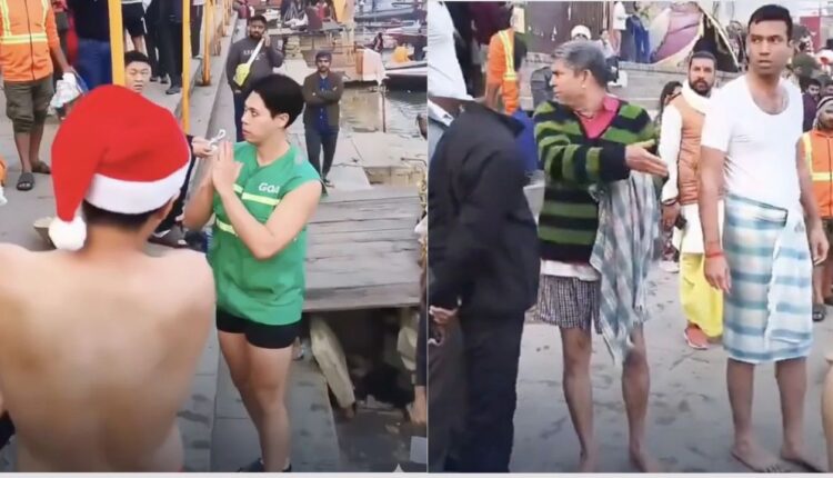 It can be seen in the video that the tourists are wearing Santa caps and one of them is wearing red colored swimwear. Meanwhile, some devotees reach there and start arguing with the tourists, accusing them of urinating in the Ganga.
