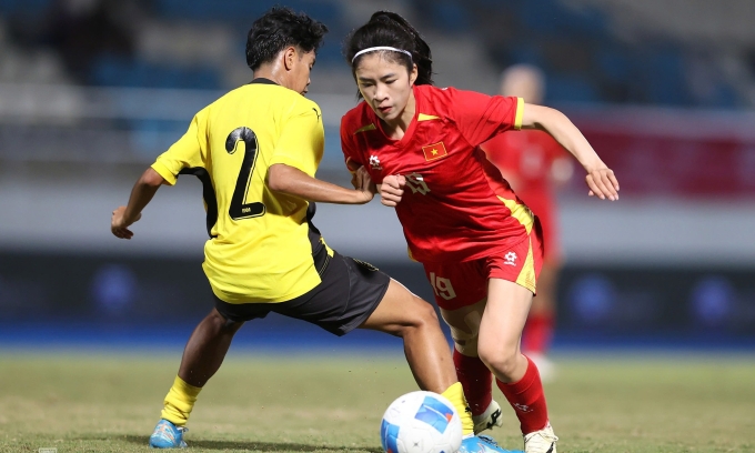 Thanh Nha runs past a Malaysia player in Vietnam’s 7-0 victory in their SEA Games 33 opening match in Chonburi, Thailand, Dec. 5, 2025. Photo by Read/Duc Dong