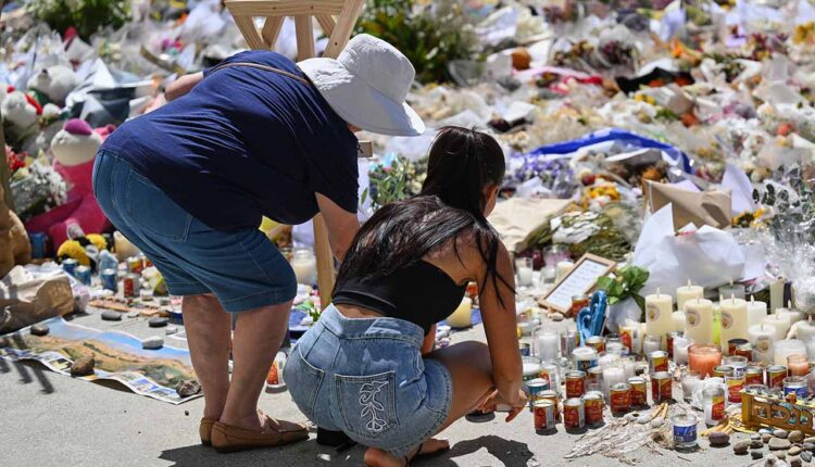 People add to a floral tribute outside Bondi Pavilion at Bondi Beach in Sydney