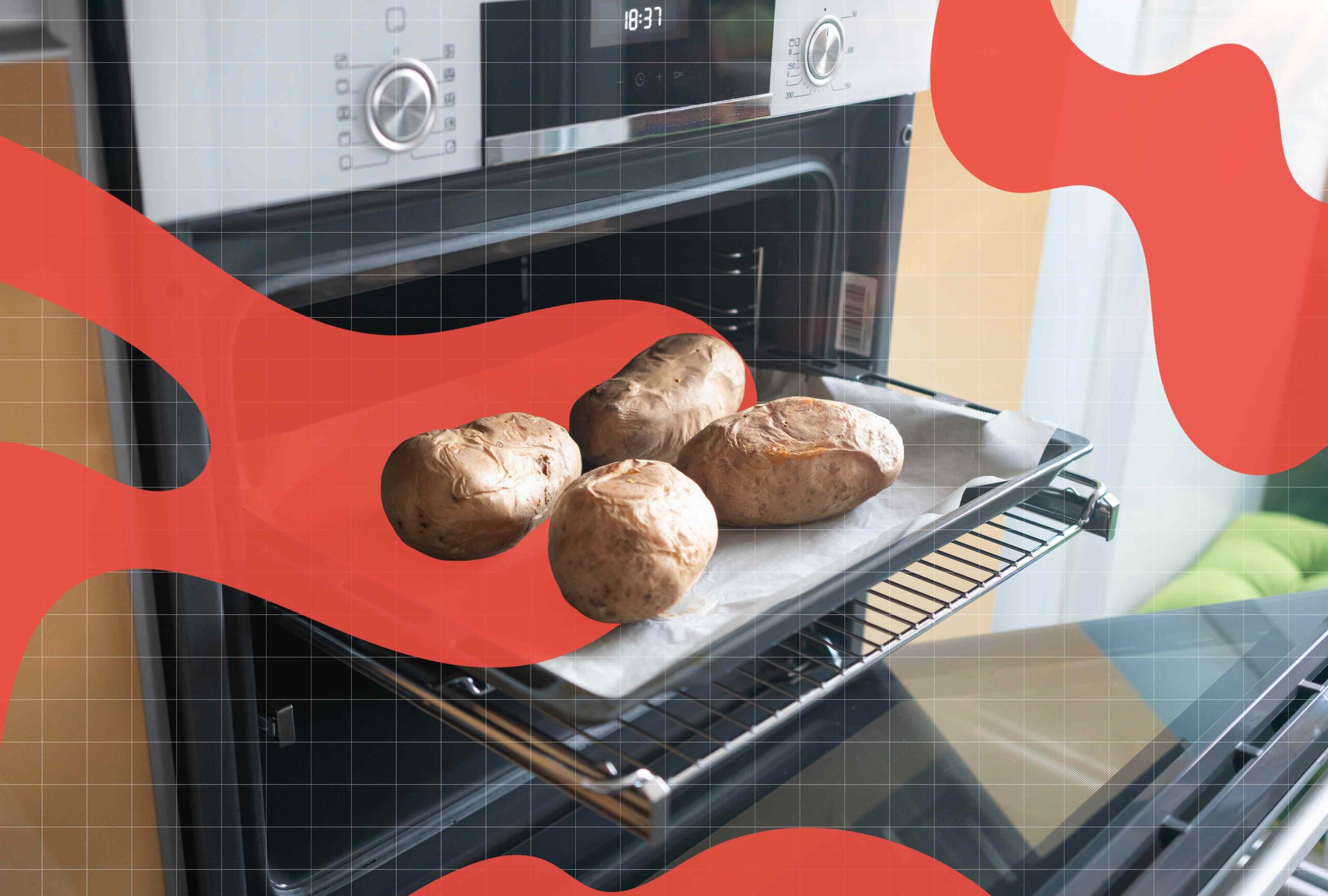 The chefs we spoke with recommend a moderately hot oven, somewhere from 375°F to 425°F. Once the oven is preheated, place the potatoes directly on the oven rack for about 50 minutes. You can also bake the potatoes on a wire rack set on a large rimmed baking sheet. Either way, avoid direct contact with a baking sheet, which can cause uneven cooking or dry spots.
