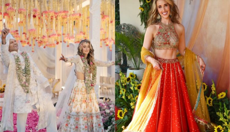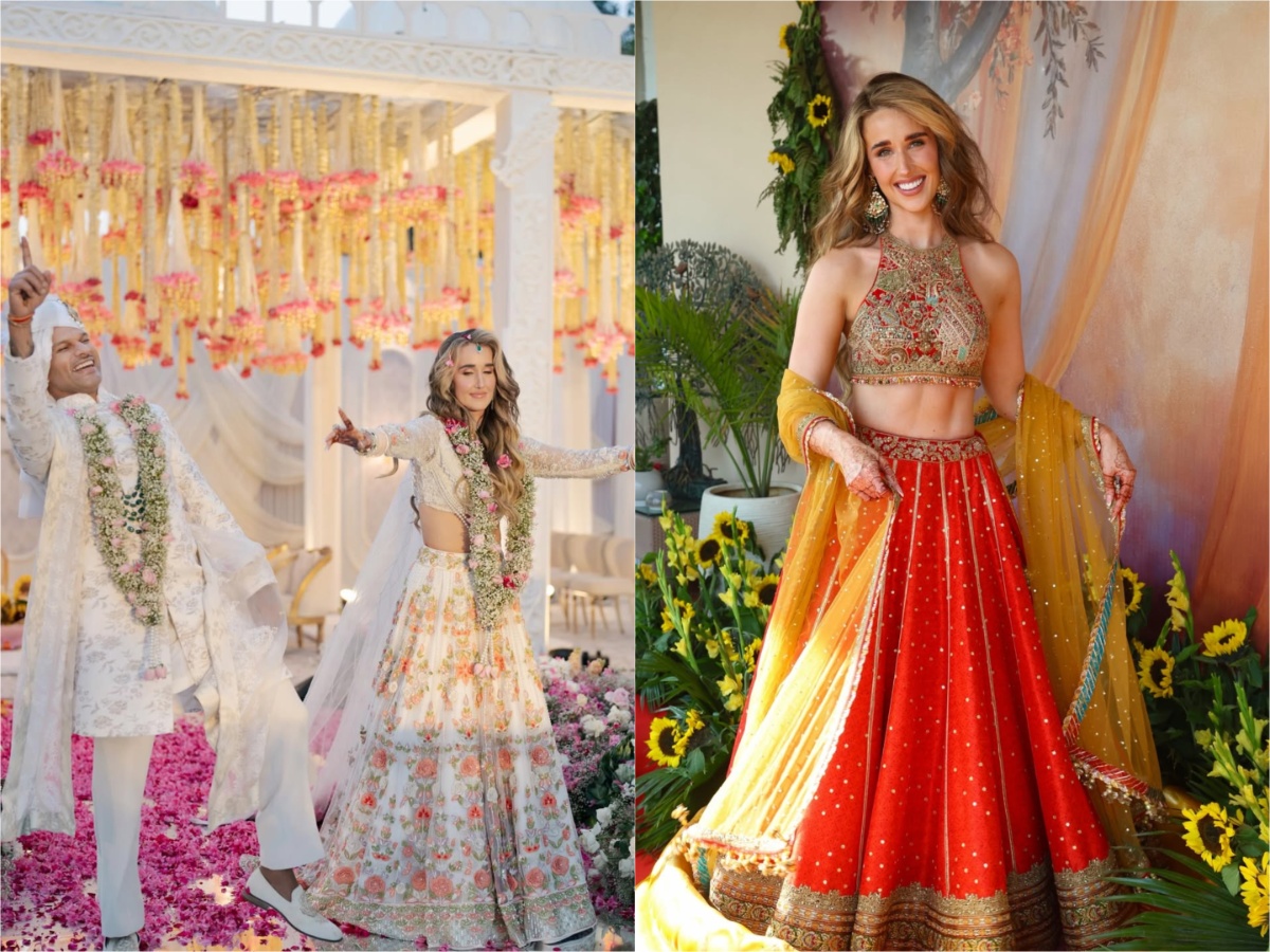At their wedding, the couple chose a serene all-white theme. Sophie looked radiant in a white lehenga adorned with intricate red and peach floral embroidery, while Shikhar complemented her in a white embroidered sherwani.
