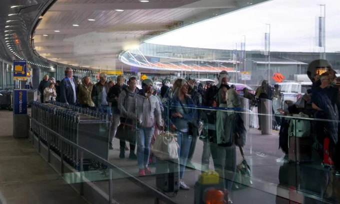 Air travelers waiting outside Terminal 8 in long TSA security lines at John F. Kennedy International Airport, in Queens, New York City, on March 27, 2026. Photo by Reuters