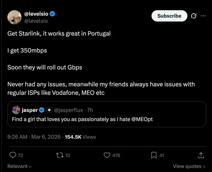 X is testing a new ad format that inserts a recommendation directly underneath a post that references the company or its products. The initial test, spotted by an X user in Europe, displayed a suggestion to “Get Starlink” beneath a post from a user that said Starlink’s satellite service works great in Portugal. The link, when clicked, directed users to Starlink’s website.