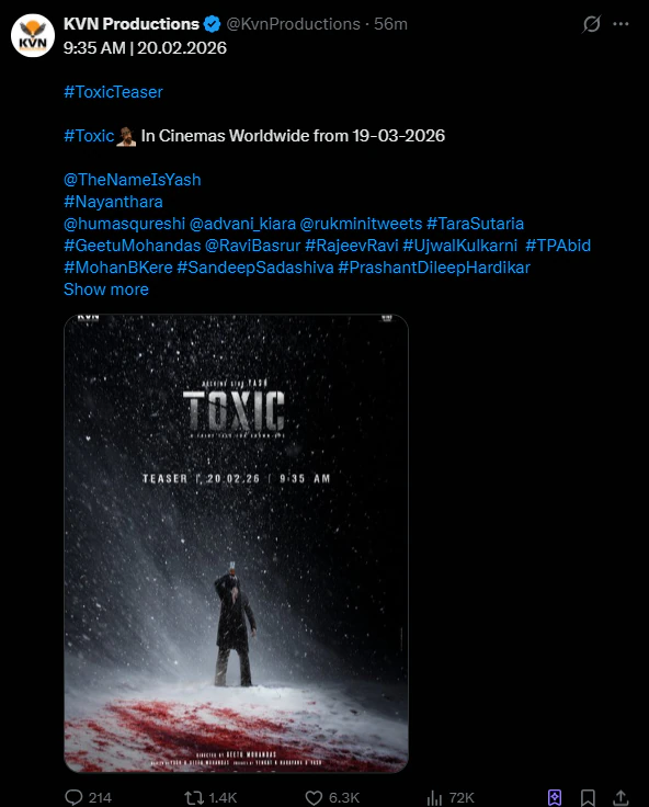 New Delhi: Get ready for a cinematic showdown. Kannada superstar Yash is back with a bang in the teaser of Toxic: A Fairy Tale for Grown-Upsdropping on February 20. Packed with dark action, steamy romance, and brutal violence, it promises a gritty gangster tale set against a drug cartel in 90s Goa.